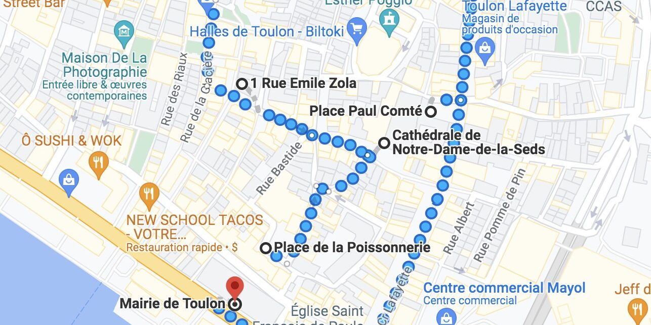 Nous avons fait un petit tour de la vieille-ville de Toulon, en remontant par la rue d’Alger et en redescendant par le cours Lafayette, en choisissant une douzaine d’emplacements pour permettre à une personne ne pouvant pas marcher trop longtemps de faire ce tour avec des haltes régulières. Et à trois endroits la possibilité de satisfaire au premier besoin serait bienvenue.