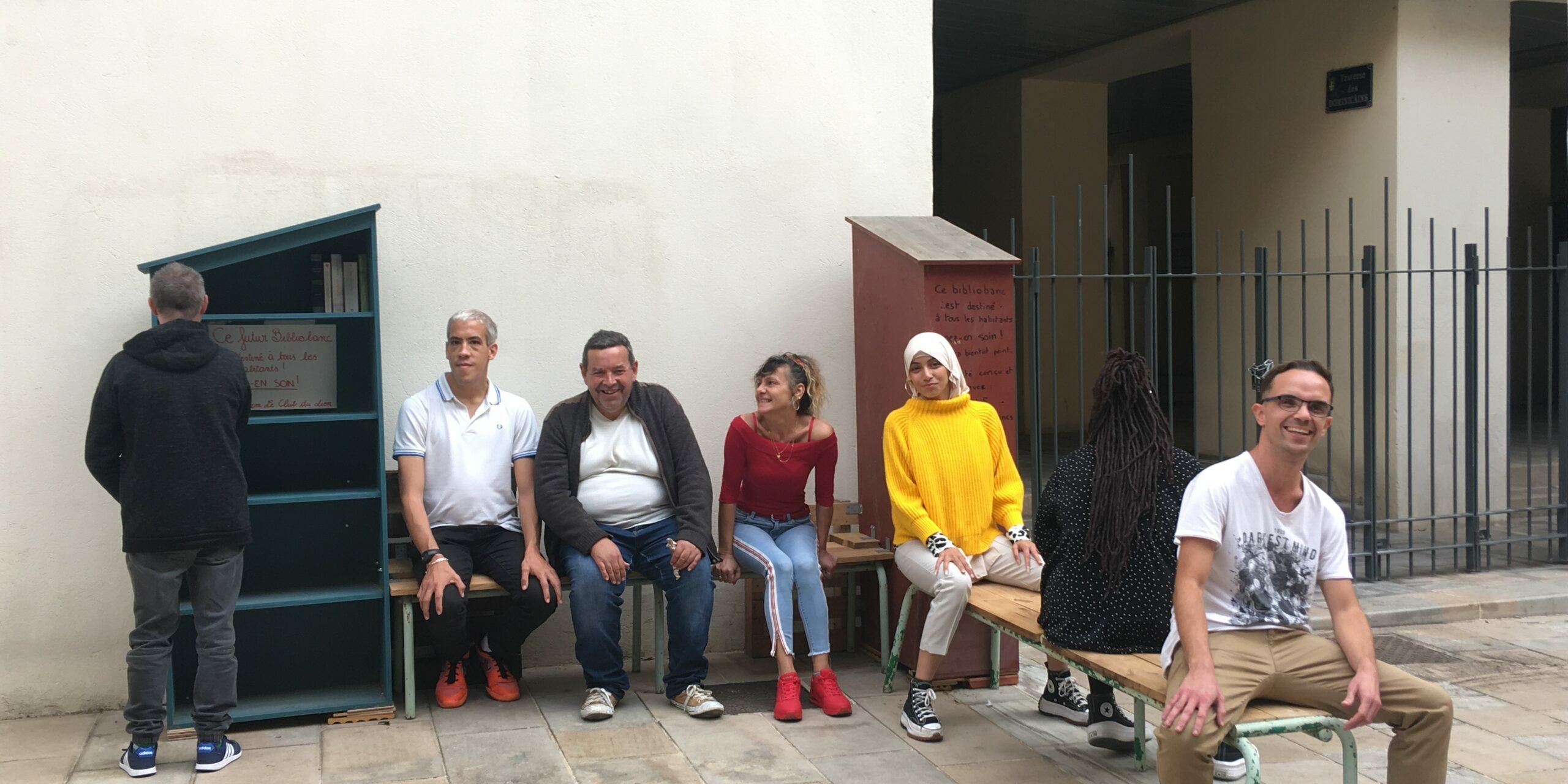 Avec l’aide du CAUE, des Menuisiers du Coeur et du GEM Club du Lien, les Robins des Bancs ont construit un banc bibliothèque place Grand Couvent (avec l’accord de la mairie et du bailleur !)