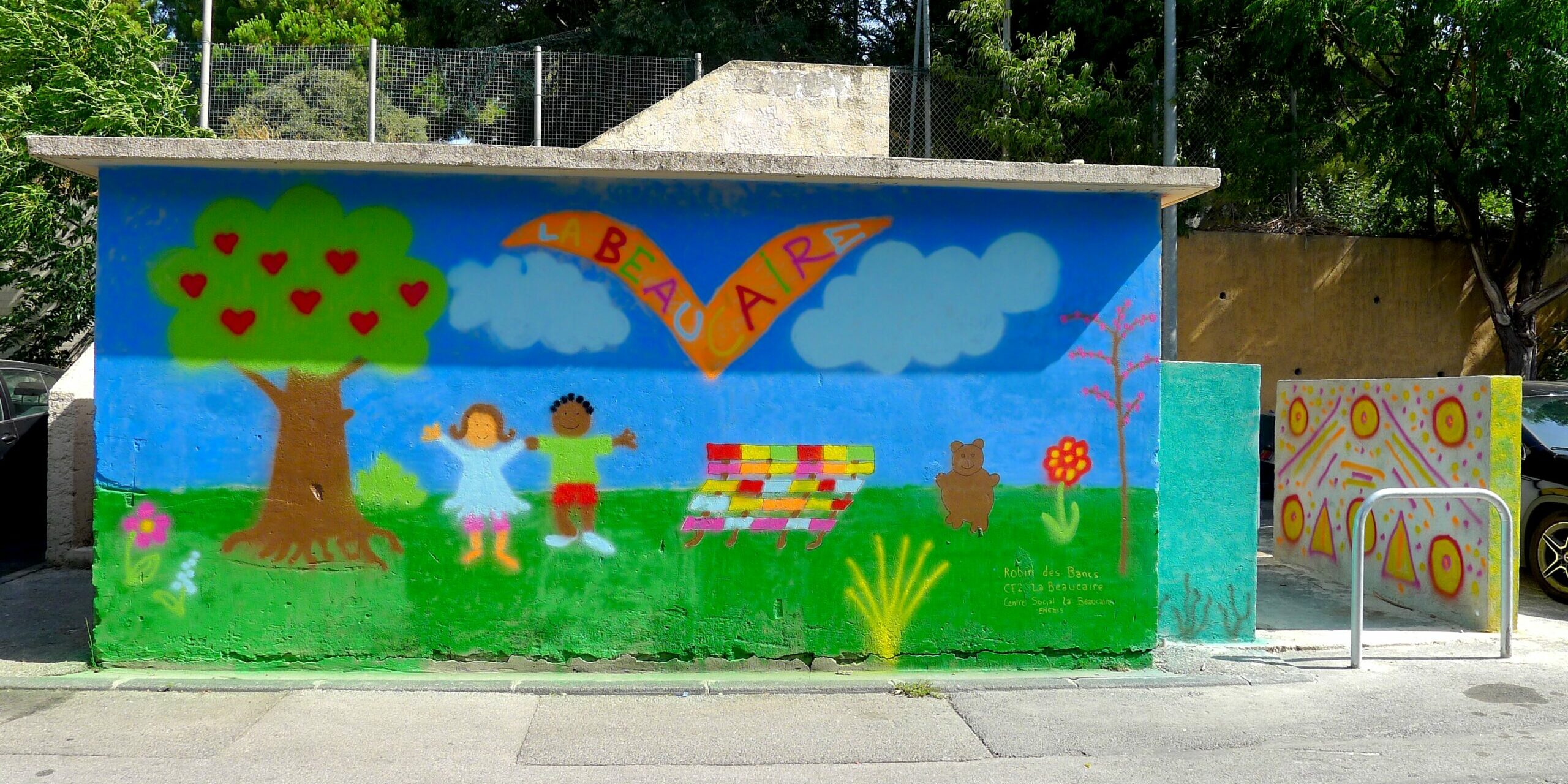 Suite à nos réalisations dans les écoles, Enedis nous a confié la décoration du transformateur de La Beaucaire. Nous avons demandé à des élèves de CE2 de La Beaucaire d’imaginer des dessins pour décorer le transformateur. Puis nous avons regroupé ces dessins sur une photo du transformateur. Le 30 juillet, des jeunes du centre social, des habitants du quartier et des bénévoles de Robin des Bancs se sont attaqués à la réalisation de cette déco. Tout n’est pas terminé, nous reviendrons en Août !